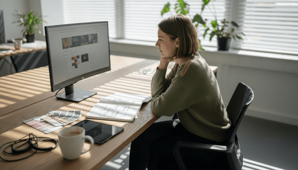 Web designer reviewing website at bright desk